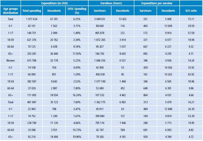 El gasto en el último año de vida para población >65 años correspondió al 18% con una razón de gasto entre fallecidos y sobrevivientes de 4.7. Para todas las edades el gasto en el último año de vida fue 6.2% y la razón de gasto entre fallecidos y sobrevivientes fue de 15.1.