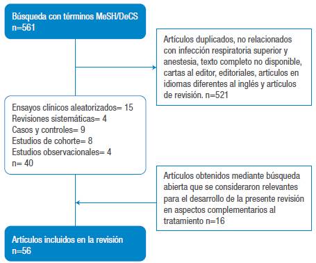 La inclusión de cada una de las referencias de la presente revisión se definió en consenso por dos coautores y fueron seleccionadas revisiones sistemáticas con o sin metaanálisis, ensayos clínicos, estudios de cohorte, casos y controles y estudios observacionales. Se desestimaron artículos que no tuvieran relación con la infección respiratoria superior y anestesia, manuscritos con texto completo no disponible, editoriales, cartas al editor y artículos de revisión narrativa. No obstante, hubo necesidad de incluir algunos manuscritos de este último tipo con el fin de complementar tópicos de la revisión diferentes al tratamiento (Figura 1 ).