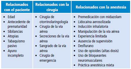 La manipulación de la vía aérea, en especial en planos anestésicos superficiales, aumenta el riesgo de EARP. La frecuencia de estos es mayor con el tubo endotraqueal que con los dispositivos supraglóticos y mayor con estos que con la ventilación con máscara facial 43,44.