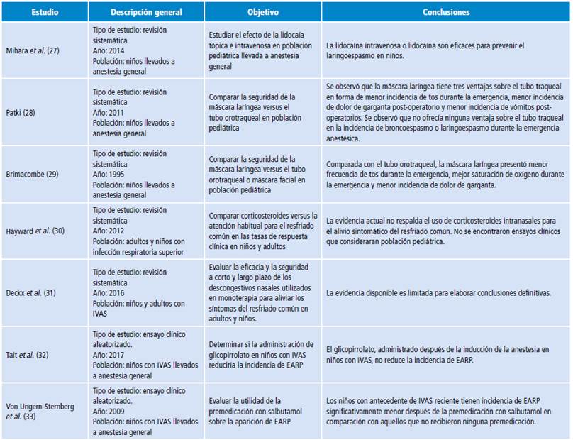 Se realizó una búsqueda estructurada de la literatura en las bases de datos ProQuest, EBSCO, ScienceDirect, PubMed, LILACS, Embase, Trip Database, SciELO y Cochrane Library con los términos Anesthesia AND Respiratory Tract Infections AND Complications; Anesthesia AND Upper respiratory tract infection AND Complications; Anesthesia, General AND Respiratory Tract Infections AND Complications; Anesthesia, General AND Upper respiratory tract infection AND Complications; Anesthesia AND Laryngospasm OR Bronchospasm. La búsqueda se hizo en inglés con sus equivalentes en español.