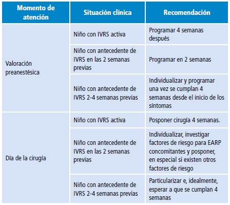 No existe consenso en la literatura respecto al algoritmo de manejo de niños con infección de la vía aérea superior activa o reciente en el contexto de la cirugía electiva. Un abordaje lógico debería tomar en cuenta la cronología de la infección y la presencia de factores de riesgo para EARP concomitantes. A excepción del niño con rinorrea aislada, no debería programarse para cirugía electiva ningún paciente pediátrico con infección respiratoria de la vía aérea superior hasta cuatro semanas después del inicio de la enfermedad, aunque la reprogramación de la cirugía no garantiza la ausencia de IVRS, ya que los niños en edad preescolar y escolar pueden llegar a tener de seis a ocho episodios por año 25. En la Tabla 3 se describe un algoritmo de manejo en consideración a la disminución significativa del riesgo de EARP después de dos a cuatro semanas de instaurada la infección 35,36.