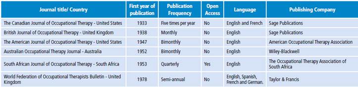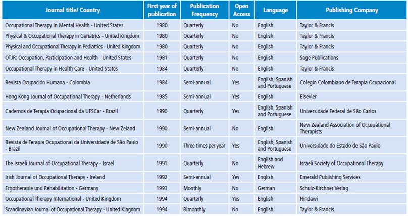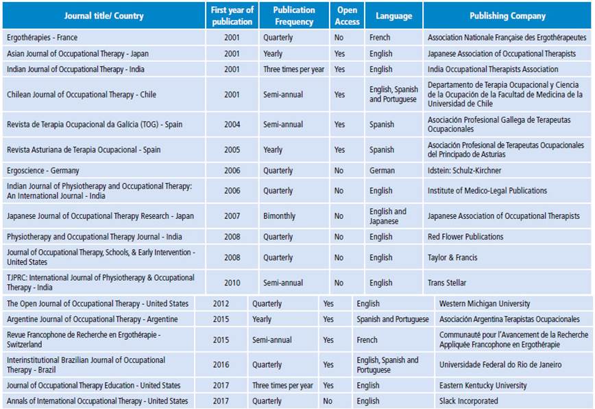 Descriptive study in which a characterization was made based on a quantitative approach. All electronic OT journals available were considered for the study. Inclusion criteria: online availability, use of the term "occupational therapy" in the journal title, and regular publication frequency. Furthermore, "occupational therapy" and "ergotherapy" terms were used for searching the journals. Exclusion criteria: journals without a regular publication frequency at the time of data collection (from January to May 2017), and journals considered as magazines or advertising publications.
