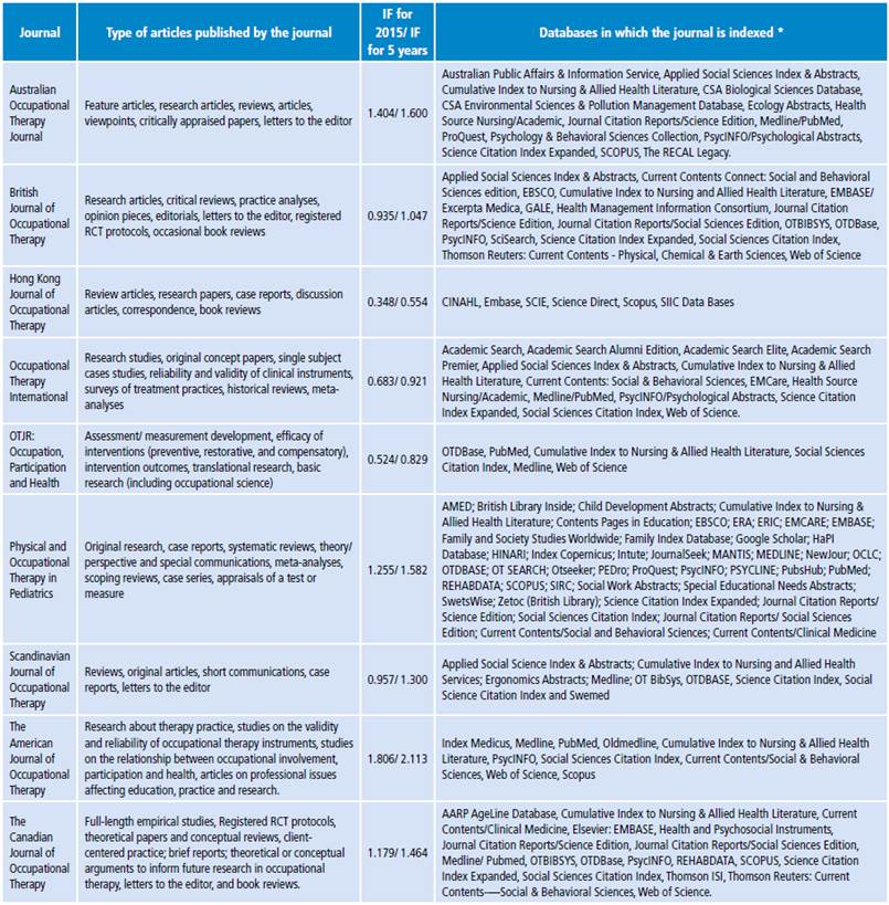 The American Journal of Occupational Therapy had the highest impact factor for 2015 and for the past five years (2009-2014), 1.806 and 2.113, respectively. In general, the average impact factor in in 2015 was 1.010, and all 9 OT journals with impact factor are indexed in approximately 139 different databases. The databases in which the most of these journals are indexed are Journal Citation Reports/Social Sciences Edition (n=7), CINAHL (n=6), Medline (n=6), Science Citation Index Expanded (SciSearch - n=6), OTDBase (n=5), and PsycINFO (n=5).