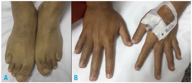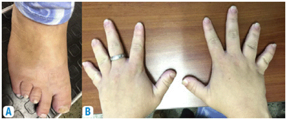Figure 2: Phenotypic traits of Albright's hereditary osteodystophy, case 4. A) shortening of the third and fourth metatarsal; B) shortening of the third and fourth metacarpal.