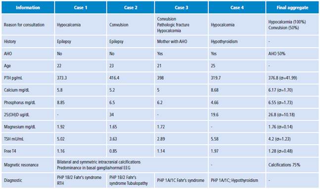 Four patients met the inclusion criteria. All PHP cases were diagnosed in adulthood despite strong early clinical and laboratory evidence of the disease. Three patients were diagnosed with Fahr's syndrome and two with Albright's hereditary osteodystrophy. The mean values obtained were PTH of 376.8 pg/mL, calcium of 6.17 mg/dL and phosphorus of 6.55 mg/dL.