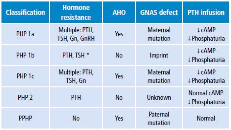 PHP is classified into different subtypes based on the phenotype, the hormonal resistance pattern, the genetic defect and the renal response to exogenous PTH infusion. (Table 2) The phenotype is defined by the presence or absence of AHO, and hormone resistance is determined by the resistance to other hormones dependent on the Gsa protein system, such as TSH, gonadotropins or GH. 10 PPHP presents the typical AHO phenotype in an isolated manner, without biochemical alterations in the phosphocalcic profile since there is no resistance to the action of PTH. 4