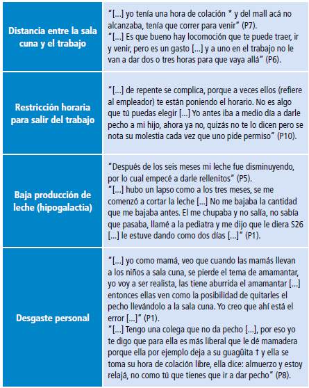 Existen obstaculizadores de la lactancia como dificultades para salir del trabajo y asistir a la SC para amamantar, baja producción láctea y elección voluntaria de destete. Como facilitadores destacan la red familiar y el apoyo de la pareja. La SC es reconocida como la institución que brinda cuidado y seguridad al hijo.