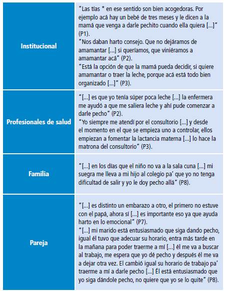 Las redes de apoyo identificadas por las madres están constituidas por la pareja, la familia, los profesionales de salud y la SC. La pareja brinda principalmente apoyo emocional; la familia colabora con transmisión de conocimiento prácticos, valoración de la LM y traslados del niño; los profesionales aportan información y ayudan en la resolución de problemas clínicos, y la SC se constituye como un espacio de seguridad, bienestar, aprendizaje del hijo y facilitador de la LM.