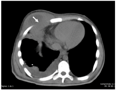 Figure 1 shows consolidation of the middle lobe and ipsilateral pleural effusion, along with hypodense mass projected on the pectoral muscular section. The arrow indicates the point where pleural collection passes through the muscular section of the chest wall into the subcutaneous cellular tissue of the right pectoral region.
