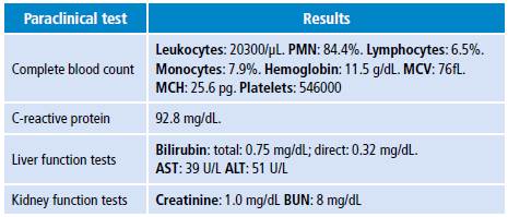 Physical examination showed a patient with blood pressure of 100/68mmHg, heart rate of 76 beats per minute, respiratory rate of 17 breaths per minute and oxygen saturation of 94% to the environment. He also had multiple caries and gingivitis, drowsiness, hypoprosexia and diminished lung sounds in the right base. Hypochromic microcytic anemia, leukocytosis with neutrophilia, elevated C-reactive protein and normal renal and hepatic function were found in the paraclinical tests taken to the patient on admission (Table 1).
