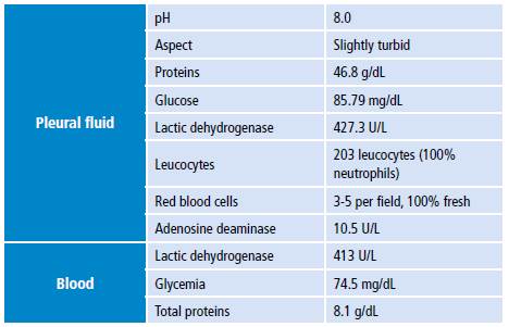 A diagnostic thoracentesis was performed, which allowed obtaining clear fluid with characteristics of simple parapneumonic effusion (Table 3). Culture of this sample was taken for common germs, which was negative.