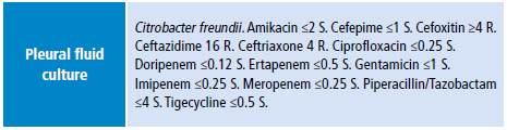 Percutaneous drainage was established for treating and diagnosing the collection. ADA (adenosine deaminase) and culture were performed for mycobacteria, which were negative, as well as a culture for common germs with C. freundii isolate with hyperproduction of class C chromosomal beta-lactamase and sensitive to aminoglycosides and fluoroquinolones (Table 4). Cefepime was administered for four weeks and the scheme was completed with oral ciprofloxacin for four weeks more. Respiratory and neurological symptoms completely resolved, and the thoracic mass disappeared.