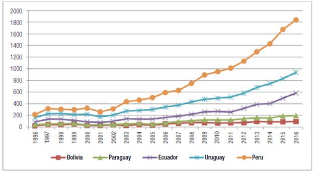 Figure 1: Comparison of the level of scientific production in Bolivia, Paraguay, Ecuador, Uruguay and Peru. 1996-2016.