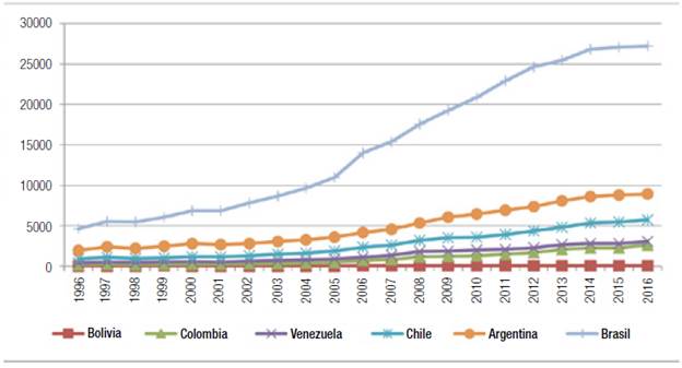 Figure 2: Comparison of the level of scientific production in Bolivia, Colombia, Venezuela, Chile, Argentina and Brazil. 1996-2016.