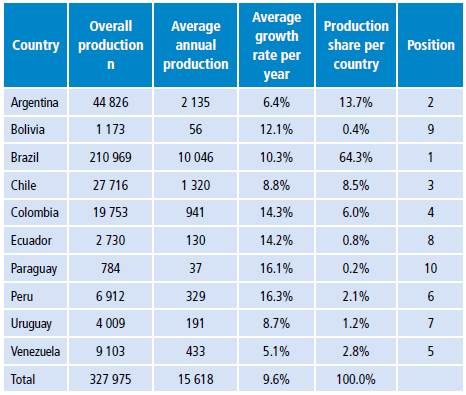 Table 1: Overall production, annual average, growth rate and participation in research in South America per country. 1996-2016.