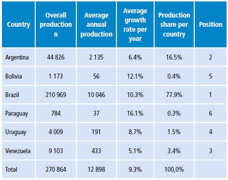 On the other hand, the average scientific production per year in the member states of Mercosur was 12 898 publications, of which Brazil contributed with an average production of 10 046 works per year; the lowest figures correspond to Bolivia and Paraguay. However, taking into account the average growth rates per year by country, Paraguay (16.1%), Bolivia (12.1%) and Brazil (10.3%) stand out.