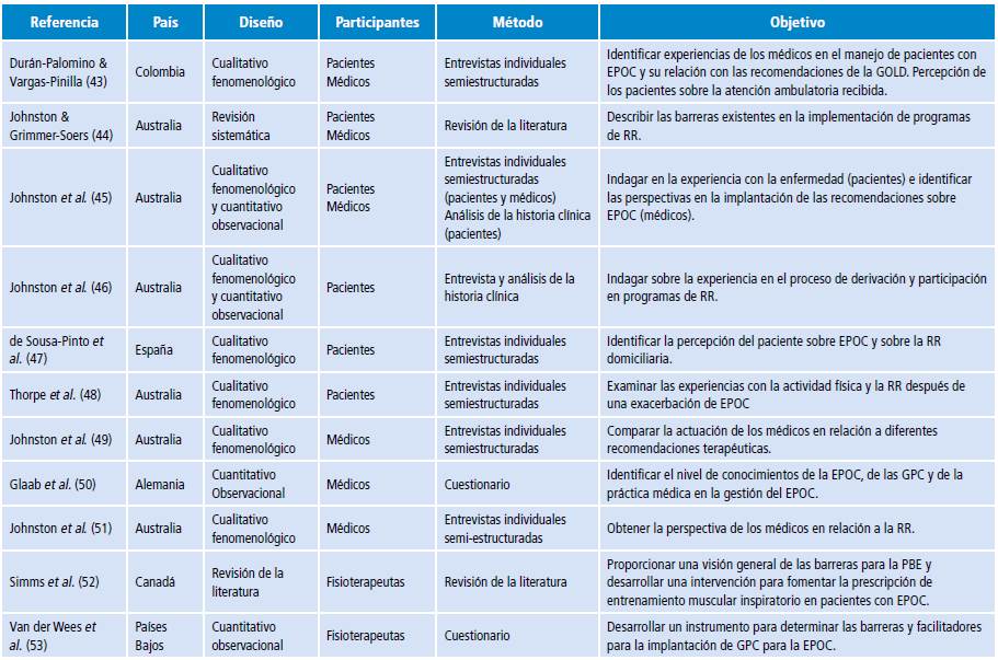 Como criterios de inclusión se tuvieron en cuenta artículos que trataran sobre EPOC y RR desde los siguientes enfoques: condicionantes para el acceso de pacientes a programas de RR, percepciones de los profesionales de referencia en los programas de RR como los médicos y los fisioterapeutas, percepciones de pacientes sobre el acceso a programas de RR y estudios sobre la implantación de las GPC en RR. Por su parte, mediante los criterios de exclusión se descartaron los artículos que trataran sobre rehabilitación de patologías diferentes de EPOC o tratamientos de EPOC diferentes de la RR; que tuvieran en cuenta una perspectiva de profesional distinta a médicos y fisioterapeutas; que profundizaran en técnicas concretas de fisioterapia respiratoria; que fueran revisiones de programas de RR sin incidir en el acceso a los mismos, estudios sobre EPOC y de patologías asociadas (asma, síndrome de apneahipopnea obstructivo del sueño) o descripciones genéricas de la implantación de RR en diferentes niveles asistenciales (hospitalario, ambulatorio, domiciliario); que usaran modalidades asistenciales no presenciales (seguimiento telefónico) o en poblaciones especiales (niños), y que el texto completo estuviera en un idioma distinto del inglés o el español.