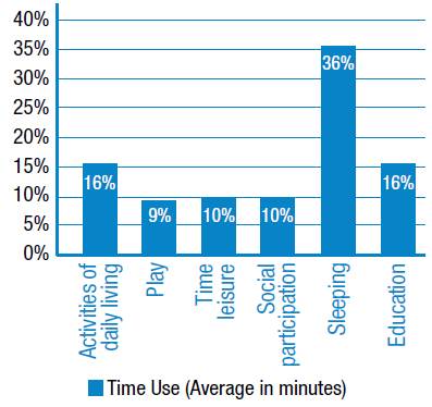 Figure 1 shows the percentage distribution of the time that participants spend daily in doing different activities according to the classification of activities of the American Association for Occupational Therapy. 21 Students use 36% of their time forresting and sleeping, and 19% in education related activities, which includes attendance to educational institutions and the time devoted outside schools to do homework and self-study. On the other hand, 16% of their time is spent in activities of the daily living such as self-feeding, bathing and dressing, while 10% is devoted to social participation activities. Finally, the time they spend in leisure and play activities represent 10% and 9% of their time, respectively.