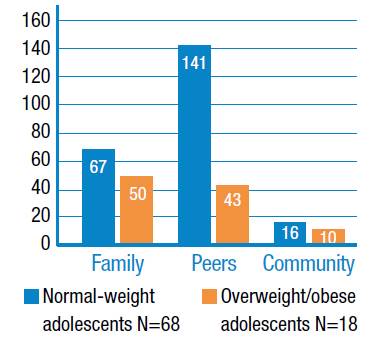 As they become more independent, adolescents are more in control of their time; therefore, their choice of activities is another factor to be considered. In Colombia, only 26% teenagers aged 13-17 years do physical activity 24 according to the minimum recommendations established by the WHO for their age range, that is, at least 60 minutes of moderate to vigorous-intensity physical activity per day, 5 days a week. 25 On the other hand, the amount of time that young people spend in activities related to media entertainment has changed over time. Franco 26, in a study conducted in Quito, Ecuador, reported that teenagers aged 12-18 in average spend 7 hours and 50 minutes in activities that involve the use of a television, a computer, a video game console, a music player, a mobile phone or a land line. This way, decisions on what to do and how much time spend in the activities they are involved could be factors that determine the adolescents' vulnerability to adopting unhealthy lifestyles and habits.