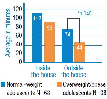 Likewise, in their daily routines, overweight/obese adolescents did not devote enough time to participate in activities that imply any type of energy expenditure, which, for the purposes of the present study, were defined as going for a walk, doing physical activity, going outside and playing with friends. In this sense, a similar finding is reported in the study by García-Continente et al.34, where an association between overweight/obesity occurrence and low levels of physical activity and increased sedentary behaviors was found.
