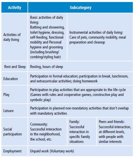In addition, Law et al. define the activities in terms of their relation to health and quality of life as activities of daily living that have been given a particular value and meaning by any individual and any cultural society, that is, daily life is based on the participation in these activities, which in turn contributes to improving the health and well-being of people. 20 There are seven types of activities 21 and each has its own subcategories, which are described in Table 1. Paid employment is also included in this classification due to the age range of the study population.