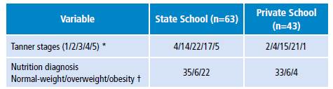 According to the nutrition diagnosis, there were 68 (62.4%) normal-weight participants, 12 (11.3%) were overweight, and 26 (24.5%) were obese. Most of overweight and obese adolescents attended the state school, as there were 28 cases (26.4%) in comparison to the 10 (9.4%) cases that were observed in the 2 private schools. Table 3 shows the distribution of the sample according to pubertal development (Tanner stages), nutrition diagnosis and type of school.