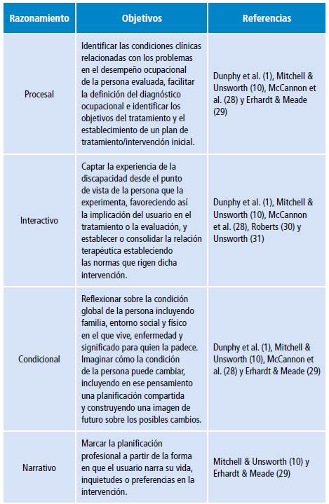 En esta línea, diversos autores 14-27 identifican diferencias entre el razonamiento de los terapeutas ocupacionales y otros profesionales del ámbito de la salud. Tales diferencias se centran en la existencia de diversas modalidades de razonamiento utilizadas por los terapeutas ocupacionales y ausentes en otros profesionales de la salud; estas modalidades son: interactiva, condicional, narrativa, ética y pragmática, compartiendo con el resto de los profesionales el razonamiento procesal (Tabla 1).