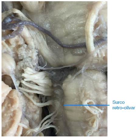 Figura 1: Surco retro-olivar donde las raíces nerviosas emergen por detrás del surco y no a través de él.