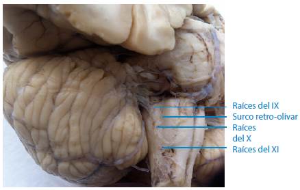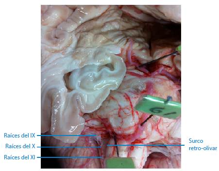 Los nervios craneales glosofaríngeo, vago y accesorio no tienen su origen aparente en el surco retro-olivar, como tradicionalmente se describe en los textos y artículos referenciados. El verdadero origen aparente de estos nervios ocurre entre 2mm a 3mm por detrás del surco retro-olivar, lugar donde se aprecia una línea continua de raicillas nerviosas que se hacen visibles en ambos lados de la médula oblongada, en específico en las áreas retro-olivares. Tampoco se encontró evidencia de ningún surco en el sitio donde supuestamente emergen las raicillas de estos nervios craneales, distinto a lo que se describe en la literatura.