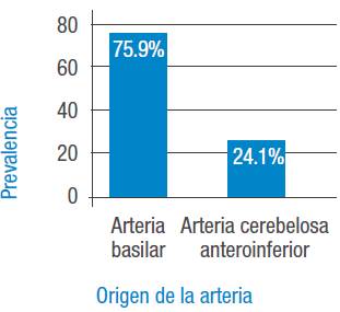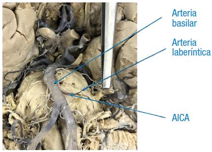 En 2013, Fajes & Katarzyna 4 describieron que la arteria basilar en su recorrido por la protuberancia puede dar origen a la arteria laberíntica como rama colateral, la cual irriga al oído interno y cuya trombosis puede producir sordera. Por el contrario, Díaz et al.5 hallaron que la arteria laberíntica, en la mayoría de los casos, se origina de la AICA en una de sus bifurcaciones y que en el 17% de los casos emana directamente de la arteria basilar.