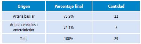 AICA: arteria cerebelosa anteroinferior; ACP: arteria cerebelosa posterior; PICA: arteria cerebelosa posteroinferior; NR: no reporta Fuente: Elaboración propia.