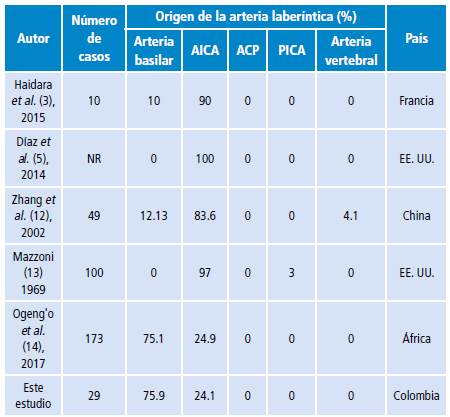Mediante el análisis de la información encontrada se podría inferir que en los reportes de población estadounidense y asiática la arteria laberíntica surge en mayor proporción de la AICA, mientras que en población africana, según Ogeng'o et al.14, dicha arteria tiene su origen en la arteria basilar con mayor prevalencia, 10 que se asemeja a este estudio realizado en Colombia.