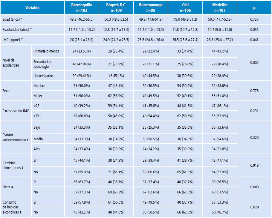 Se encuestaron 523 sujetos: 109 en Bogotá D.C., 107 en Medellín, 106 en Cali, 102 en Barranquilla y 99 en Bucaramanga y su área metropolitana. La edad promedio de los sujetos fue de 49.3 años (IC95%: 48.3-50.3), sin diferencias por ciudad (p=0.730) o sexo (p=0.778). En Medellín se observó el nivel más bajo de escolaridad: los sujetos sin educación o con educación básica primaria correspondieron al 43.2%; el nivel de educación fue diferencial para las ciudades estudiadas (p=0.002). Excepto en Bogotá, el promedio de IMC superó el límite donde es declarado el exceso de peso. En el último año más del 35% de los encuestados realizaron modificaciones en su alimentación o seguían una dieta por prescripción médica; esta situación fue diferencial en las ciudades estudiadas (p=0.000). 11% de los sujetos tenía diagnóstico de hipertensión, 5% de diabetes mellitus tipo II y 25% algún otro diagnóstico médico. Otras características de la población estudiada se presentan en la Tabla 1.
