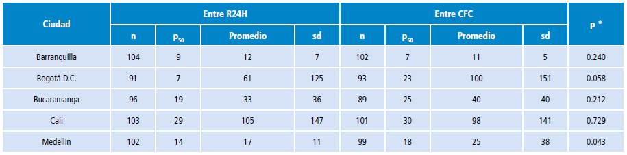 El promedio de días que pasó entre las aplicaciones del R24H y el CFC para todas las ciudades fue diferente. Entre las aplicaciones del R24H en Cali pasaron en promedio 105 días (σ=147), mientras que en Barranquilla el promedio fue de 12 días (σ=7). Entre aplicaciones del CFC en Barranquilla pasaron en promedio 11 días (σ=5), mientras que en Bogotá D.C. el promedio fue de 100 días (σ=151). Las medianas (P50) de los días que hay entre los tiempos de aplicación de los R24H y los CFC para la misma ciudad, aunque menos extremas que los promedios entre los tiempos de aplicación de los R24H y los CFC, también muestran las diferencias existentes entre ciudades (Tabla 2).