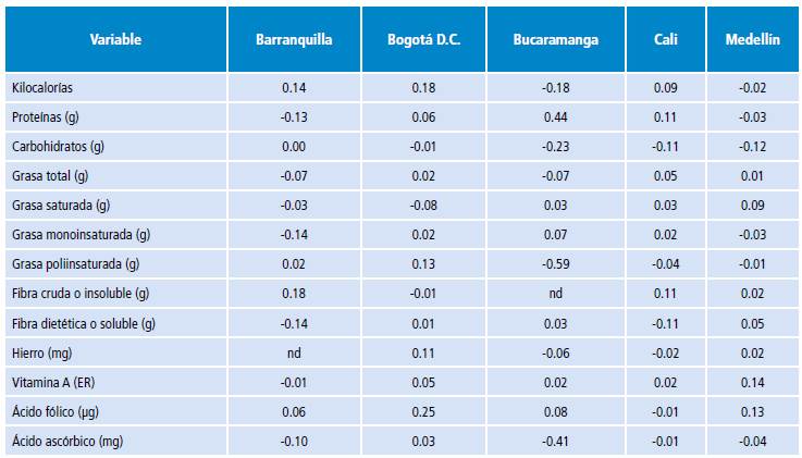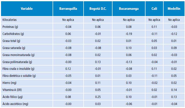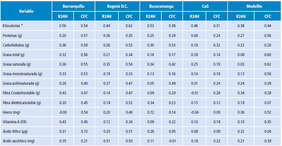 Los coeficientes de correlación de Pearson, ajustados por el método de energía residual, pueden ser considerados como pobres y moderados. Contrario a lo esperado, en general los valores de correlación crudos, tanto para los R24H como para los CFC, fueron más altos que los ajustados por el método de energía residual. Pocas variables nutricionales alcanzaron valores de correlación ajustada de 0.60 o superiores, que es lo ideal; en el R24H esto solo se evidenció con el hierro (mg) (0.72) en Bucaramanga. Para el CFC esto fue evidente con el ácido fólico (g) (0.72) en Barranquilla, las kilocalorías (0.62) en Bogotá D.C. y la grasa total (g) (0.60) y grasa saturada (g) (0.62) en Medellín. En términos generales, pero con algunas excepciones, los CFC alcanzaron mejor reproducibilidad que los R24H, sin embargo para ambos se observaron valores de correlación cercanos a cero o incluso negativos (Tabla 3).