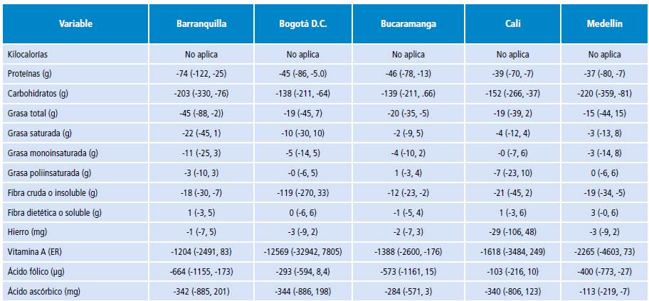 Según los CFC, la ingesta media de energía en Bogotá D.C. fue de 613 kilocalorías (σ=178) y en Bucaramanga de 658 kilocalorías (σ=207). Las tablas con los detalles de la estimación por cada método, ciudad y variable nutricional pueden ser solicitadas a los autores, pues dado el volumen de estas no se presenta la información en este escrito.