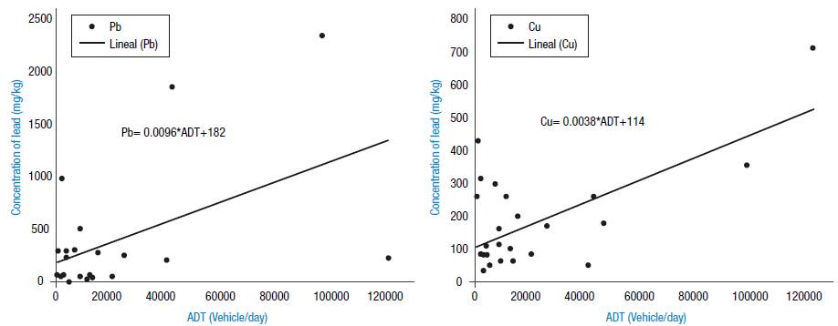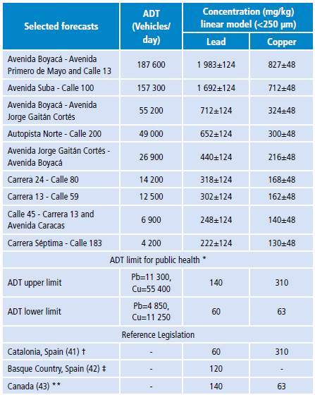 Based on the linear models obtained, the concentration of metals (lead and copper) was predicted on nine road surfaces of Bogotá, with ADT between 4 200 and f 87 600 vehicles/day (Table 4). The results showed that lead and copper concentrations in the sediment of the road with the maximum ADT (Avenida Boyacá between Avenida Primero de Mayo and Calle 13) could reach figures of up to f 93 8 mg/kg and 827 mg/kg, respectively. The maximum figures reported internationally were 2 296 mg/kg for lead and 771 mg/kg for copper (ADT between 96 000-120 000 vehicles/day). In contrast, the predictions for the road with lower ADT (Carrera Séptima with Calle 183) allowed observing lead concentrations of 222 mg/kg and copper concentrations of 130mg/kg. International reports on roads with similar ADT (3 8004 500 vehicles/day) showed lead concentrations of 14-299 mg/kg and copper levels of 90-117 mg/kg (Table 2).