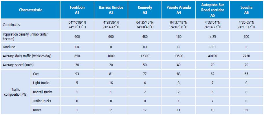 The research sites were located in the megacity of Bogotá, central Colombia (Table 1), on road surfaces in the towns of Fontibón (A1), Barrios Unidos (A2), Kennedy (A3), Puente Aranda (A4), the Southern Highway road corridor or Autopista Sur (A5), and the Soacha conurbation (A6). In addition, nine road surfaces with traffic intensities between 4 200 and 187 600 vehicles per day were used for forecasting the concentration of heavy metals in road sediments in Bogotá: Avenida Boyacá between Avenida Primero de Mayo and Calle 13; Avenida Suba with Calle 100; Avenida Boyacá with avenida Jorge Gaitán Cortés; Autopista Norte with Calle 200; Avenida Jorge Gaitán Cortés with Avenida Boyacá; Carrera 24 with Calle 80; Carrera 13 with Calle 59; Calle 45 between Carrera 13 and Avenida Caracas; and Carrera Séptima with Calle 183. Information on traffic intensity was provided by the District Department of Transportation of Bogotá D.C.