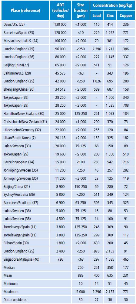 Chen et al.3 and McKenzie & Irwin 12 reported that the deposition of heavy metals on road surfaces was proportional to traffic intensity (vehicles/day). In this regard, Bannerman et al.13 and Zafra et al.14 observed that the amount of lead, zinc and copper present in runoff and road sediment could be related to the intensity of vehicular traffic. However, Barrett et al.15 suggested that traffic intensity was only significant at the local scale (road neighborhood) and that the variation of metal concentration was attributable to other factors such as emissions from industrial sources at a large scale (regional).