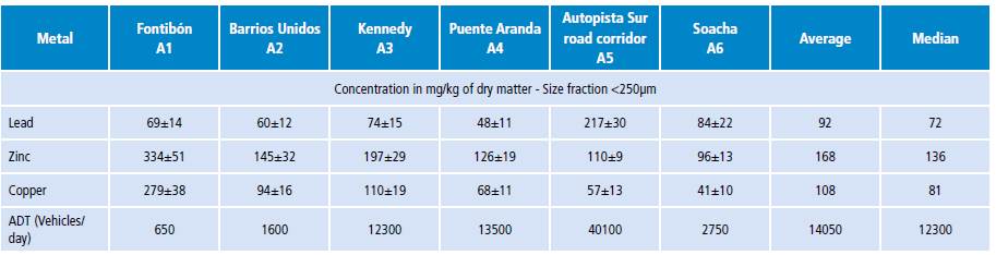 The results showed that the concentrations in the road sediment had the following sequence at the international level: zinc (358 mg/kg), lead (251 mg/kg) and copper (177 mg/kg) (Table 2). At the local level the sequence was: zinc (136 mg/kg), copper (81 mg/kg) and lead (72 mg/kg) (Table 3). Analyses of heavy metal concentrations in Bogotá focused on the size fraction <250μm of the road sediment because this was the dominant trend at the international level, as shown in Table 2.