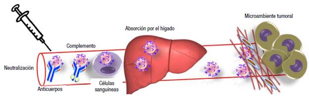 Los virus oncolíticos se estudian primero in vitro, en líneas tumorales, luego in vivo, en modelos animales, y por último en pacientes humanos. Cuando el tumor primario es de fácil acceso o susceptible a la inyección puede utilizarse la administración intratumoral (IT), pero esta aplicación se dificulta en los focos metastásicos. Para alcanzar el tumor primario y las metástasis, la alternativa es aplicar el virus por vía intravenosa (IV). No obstante, su eficiencia podría estar limitada, como se ilustra el la Figura 1, por la presencia de una respuesta inmunológica preexistente en los sujetos tratados debido a infecciones virales previas o por anticuerpos emergentes durante el tratamiento con el virus oncolítico; los virus también pueden ser neutralizados por la unión no especifica a las proteínas del suero y células circulantes del torrente sanguino o por órganos no específicos que eliminan el virus del torrente sanguíneo como el hígado y la matriz pericelular y tumoral que atrapa el virus.