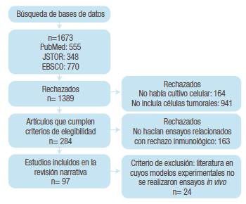 Los criterios de inclusion en la búsqueda de literatura fueron que el aspecto central de la literatura estuviera representado por el uso de virus silvestres o modificados utilizados para el tratamiento del cáncer, que su tema fuera sobre técnicas utilizadas para envolver el virus y eludir de esta manera el sistema inmunológico antes que el virus llegue al tumor y que hicieran mención sobre los métodos utilizados para aplicar el virus al paciente y hacer que este alcance el tumor; también se incluyeron propuestas de modelos para aplicar los virus oncolíticos en el tratamiento del cáncer. Como criterio de exclusión se tuvo en cuenta la literatura en cuyos modelos experimentales no se realizaron ensayos in vivo. La Figura 2 muestra el flujograma de los artículos encontrados en la revisión.