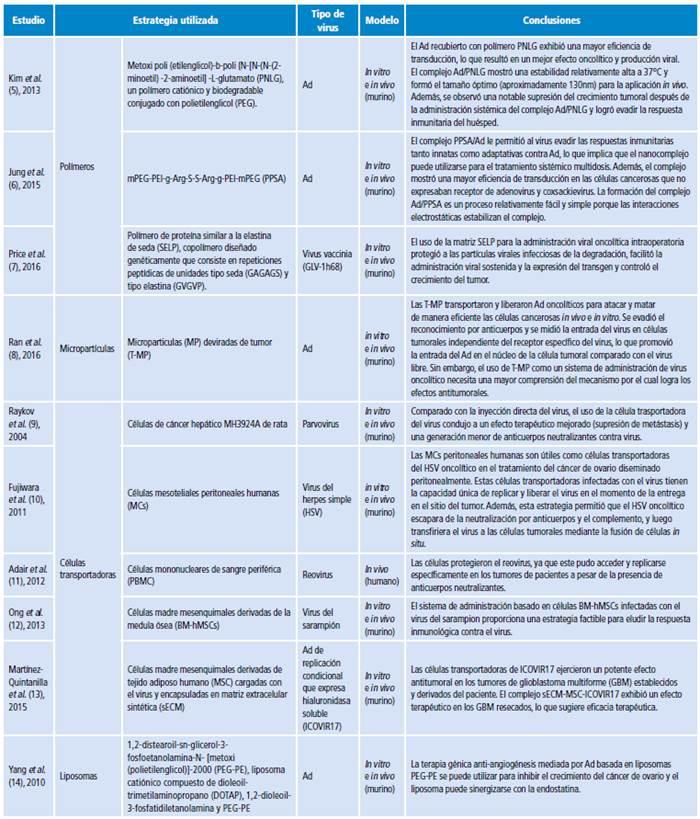 Se encontraron 1 673 artículos, de los cuales se eliminaron 1 576 por no cumplir con los criterios de elegibilidad, 163 porque no estaban relacionados con rechazo inmunológico y 24 porque no incluían experimentos realizados in vivo. Esta revisión narrativa contó con un total de 97 estudios, los cuales fueron artículos originales en inglés, realizados en diversas partes del mundo y que utilizaban estrategias para envolver y transportar virus oncolíticos para eludir la respuesta inmunológica (Tabla 1). El virus más estudiado hasta la fecha fue el adenovirus (Ad).