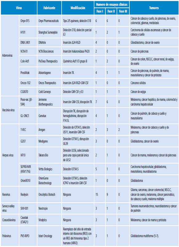 Existen diferentes tipos de virus modificados o no genéticamente que han sido utilizados en la terapia oncolítica (Tabla 2).