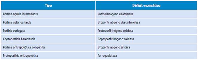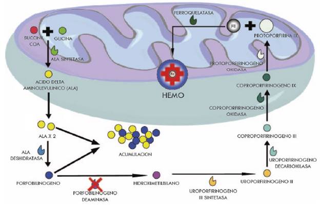 La porfiria comprende un conjunto de enfermedades metabólicas y consiste en la deficiencia de enzimas encargadas de la biosíntesis del grupo hemo, lo que produce aumento y acumulación tóxica de los precursores, afectando diversos sistemas 5-8. Factores precipitantes pueden inducir dicha toxicidad, aumentando la demanda del grupo hemo e induciendo la actividad del ácido delta aminolevulínico (ALA) sintetasa; la síntesis de productos tóxicos también aumenta.