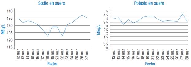 Aunado a la problemática planteada, la paciente cursó con taquicardia sinusal, alteraciones electrolíticas expresadas por constantes episodios de hiponatremia -sin alteraciones del potasio (Figura 3)-, neumonía e infección de vías urinarias, que fueron manejados a su tiempo.
