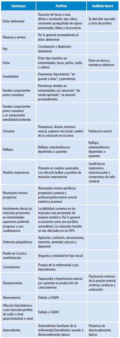 Tabla 2: Manifestaciones clínicas de porfiria y síndrome de Guillain-Barre.