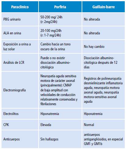 Tabla 3: Paraclínicos en porfiria y síndrome Guillain-Barre.