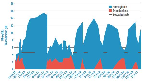 Currently, the patient is receiving infusions of bevacizumab every 4-6 months based on his hemoglobin levels, which have been maintained at an average level of 12mg/dL. When hemoglobin descends to approximately 10mg/dL, an infusion of bevacizumab 5mg/kg EV, 3-4 doses, every 2 weeks is ordered. So far, the patient has remained stable and has not required blood transfusions.