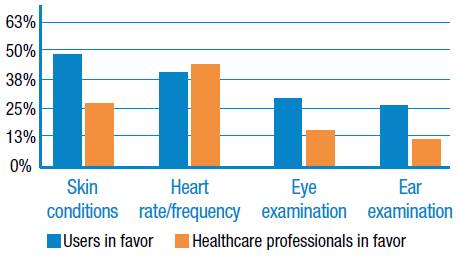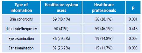 The majority of participants were not in favor of using this type of devices to send information about heart rate/frequency (HSU 41%, HP 46.1%) or eye exams (HSU 29.5%, HP 14.2%) (Table 3). With respect to their use in dermatological pathologies, it was significantly (p=0.001) less approved by the HP than by the HSU (14.2% vs. 29.5%, respectively).